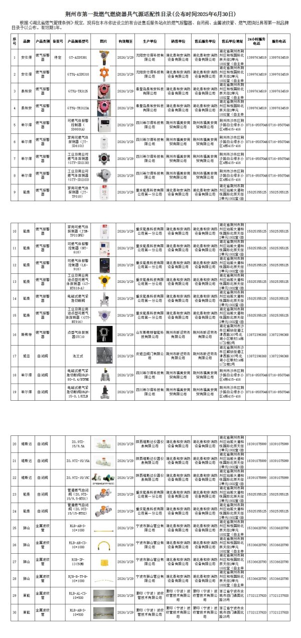 根据《湖北省燃气管理条例》规定,现将在本市依法设立的有合法售后服务站点的燃气报警器、自闭阀、金属波纹管、燃气燃烧灶具等第一批品牌目录予以公布。有效期1年。