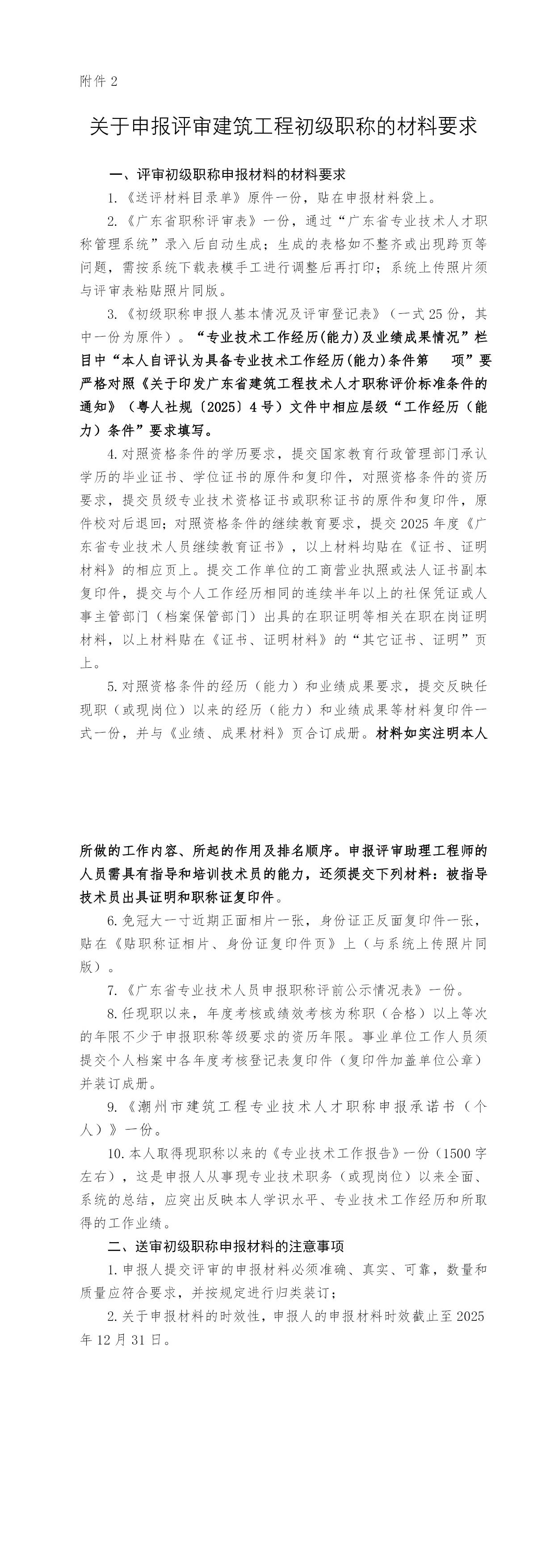 3.《初级职称申报人基本情况及评审登记表》(一式25份,其中一份为原件)。“专业技术工作经历(能力)及业绩成果情况”栏目中“本人自评认为具备专业技术工作经历(能力)条件第 项”要严格对照《关于印发广东省建筑工程技术人才职称评价标准条件的通知》(粤人社规〔2025〕4号)文件中相应层级“工作经历(能力)条件”要求填写。